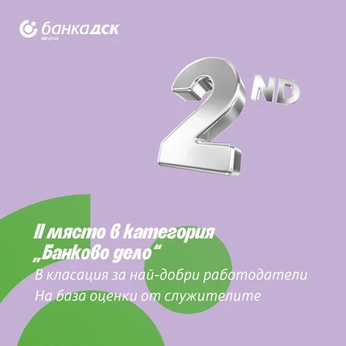Банка ДСК заема второ място в категория „Банково дело“ в независима класация за най-добрите работодатели в страната за 2025 - оценка, която идва директно от нашите колеги!