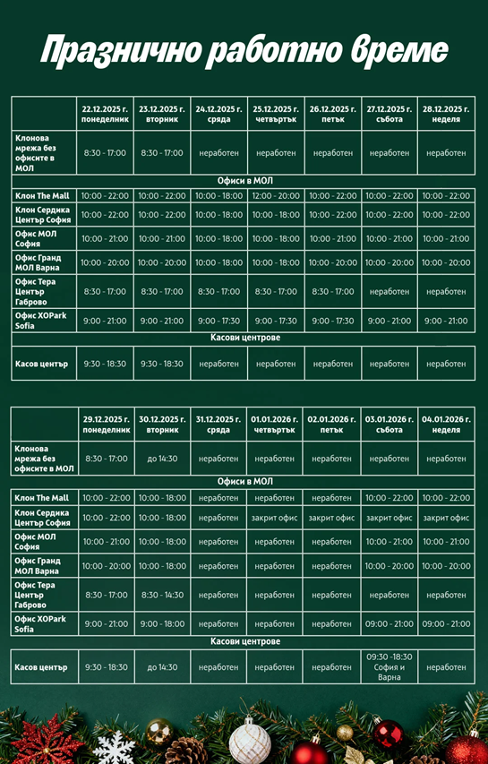 Във връзка с предстоящите празници, споделяме празничното работно време на офисите ни, които ще са на Ваше разположение. Касовите ни центрове също ще работят в някои от дните, за да можете да обменяте пари в евро.
