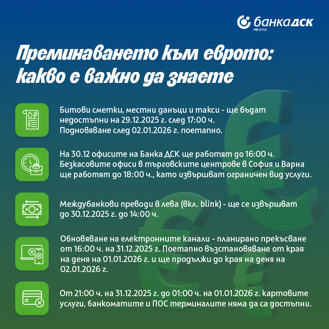 На 1 януари 2026 г. България приема еврото като национална валута. В нощта на 31 декември срещу 1 януари ще се проведе техническо превключване на банковите системи, за да осигурим плавен и сигурен преход към новата валута.